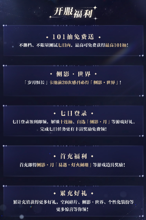 开服期间,游戏内也安排了一系列的道具、抽卡福利。玩家登录并完成游戏内的一系列任务、活动,最高可免费获得101抽的抽卡机会。常驻卡池「岁月恒长」,前20次感召必得「侧影·世界」,另有七日签到、首充、累计充值等奖励可解锁。
